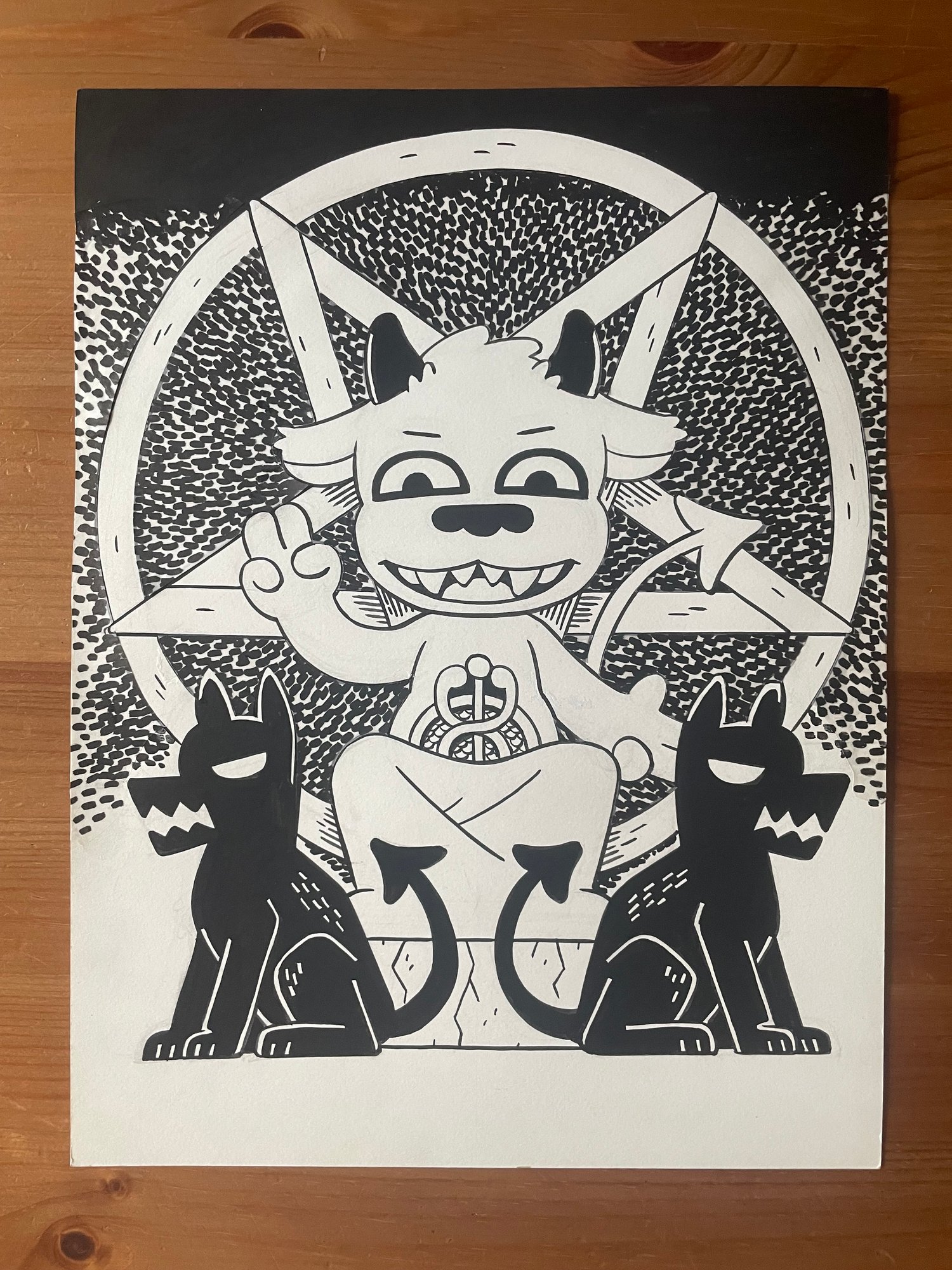 This is the original drawing from one of my t-shirt designs. All of the texture was created as sort of an overlay on tracing paper which I've sliced up and affixed to the surface, so it has kind of a collage feel. It's neat! I think it's a cool piece. India ink on Bristol board. 2021. 9" x 12"
