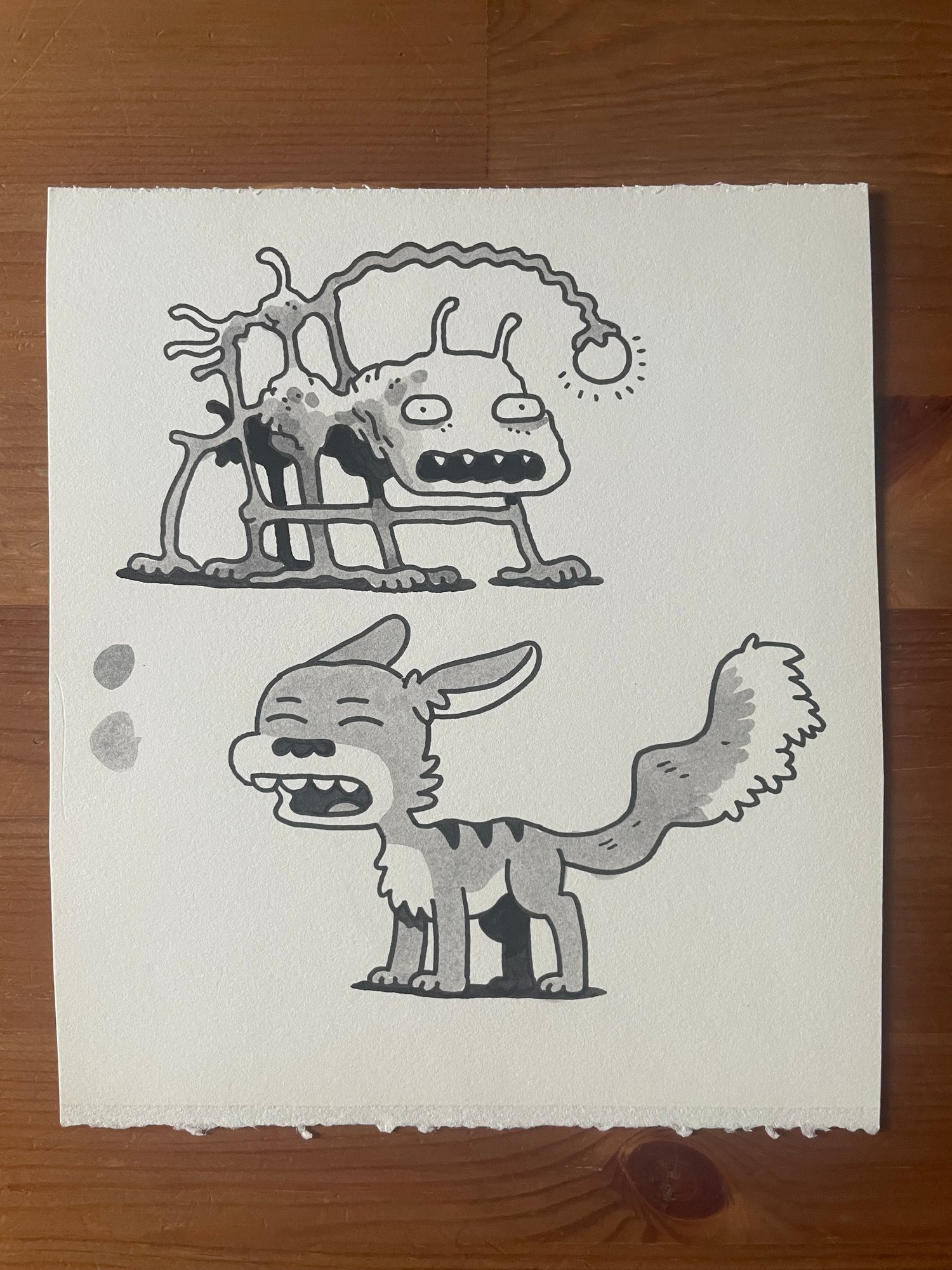 Another dumb little doodle. Do not remember when I drew this, sometime during the pandemic I guess. Pen and ink on fancy white cardstock. 6.5 " x 7.5"