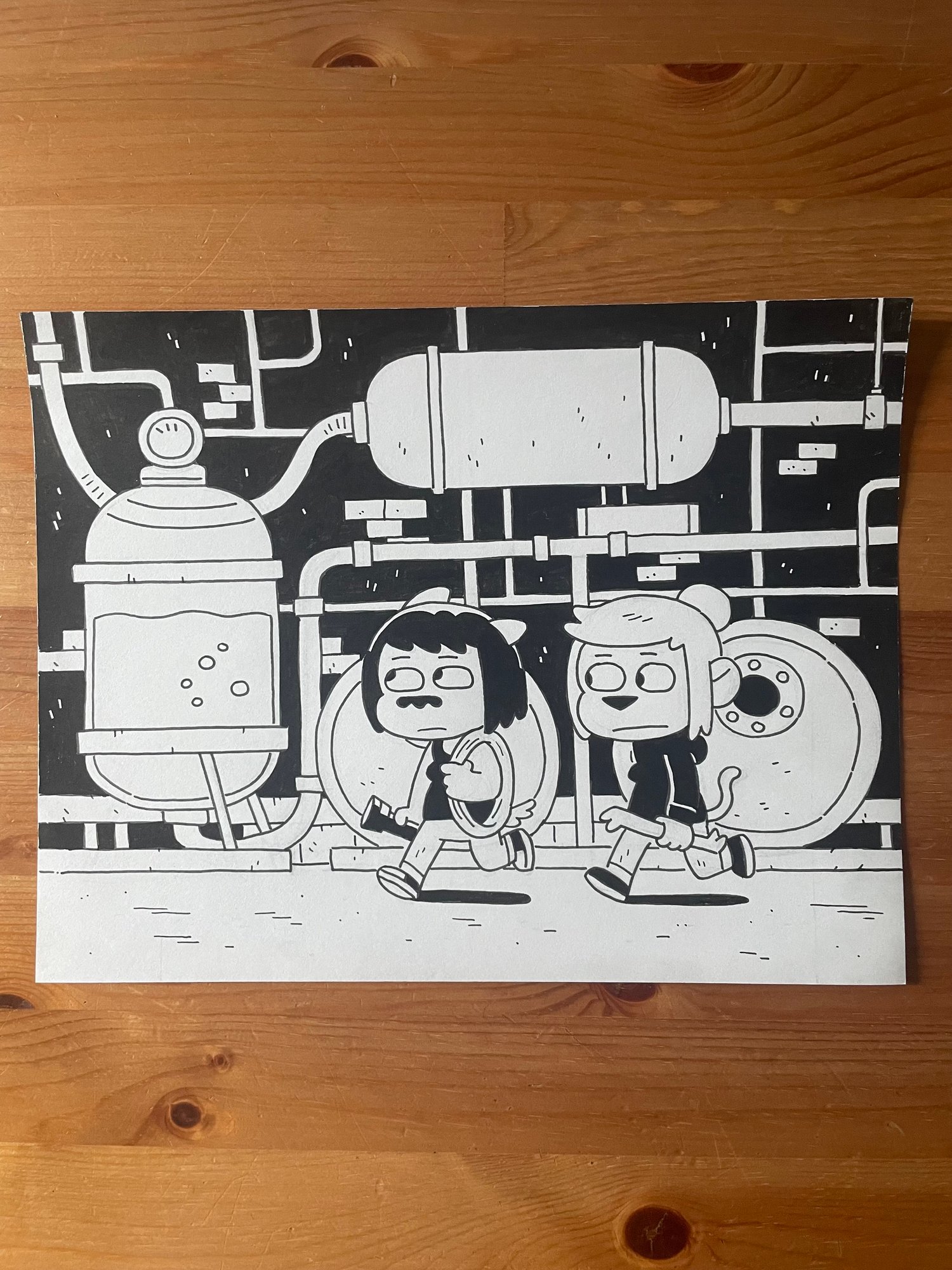 Concept art for The Well. Earlier drafts of the story had it where Dave was the one who got kidnapped and Veronika and Persephone had to rescue him. Pen and India ink on gray cardstock. 2020. 11" x " 8.5"