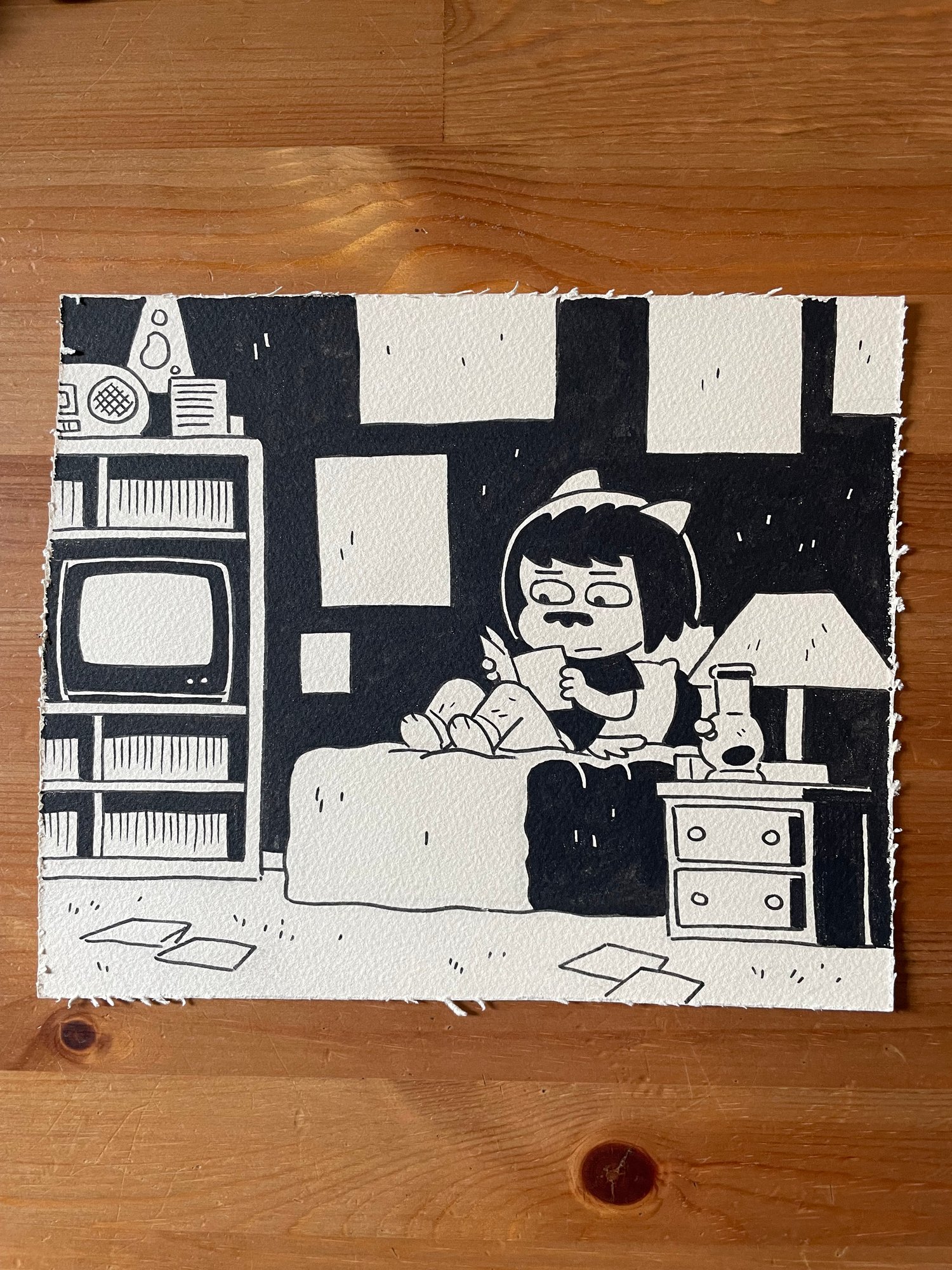 Early concept art for The Well. Matt is out of town and Veronika is crashing at his place. Pen and India ink on textured, cream-colored cardstock. 2020. 9.5" x 8" (slightly irregular cut)